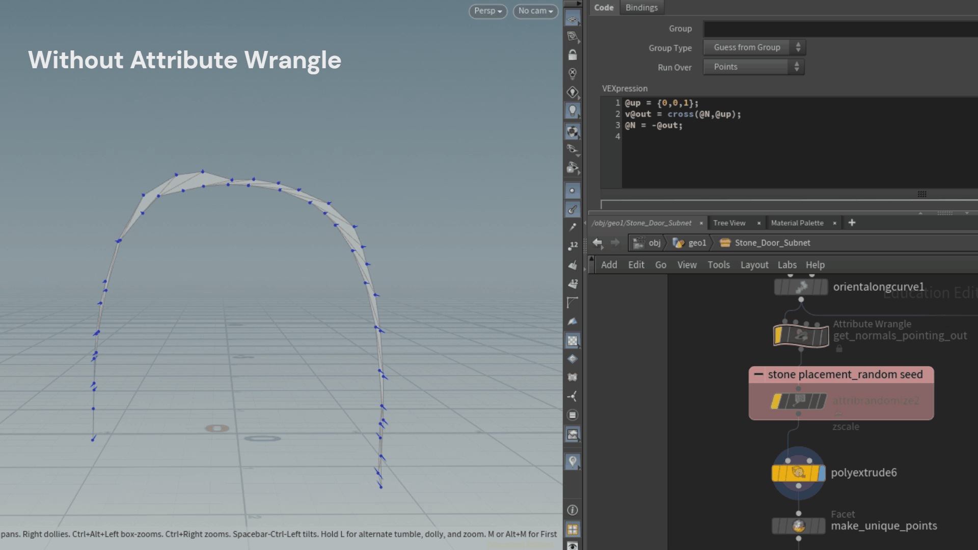 The next step involved extruding planes outward from the line to serve as the base for the stones. To ensure the extrusion was directed outward, I added an Attribute Wrangle that adjusted the normals accordingly.