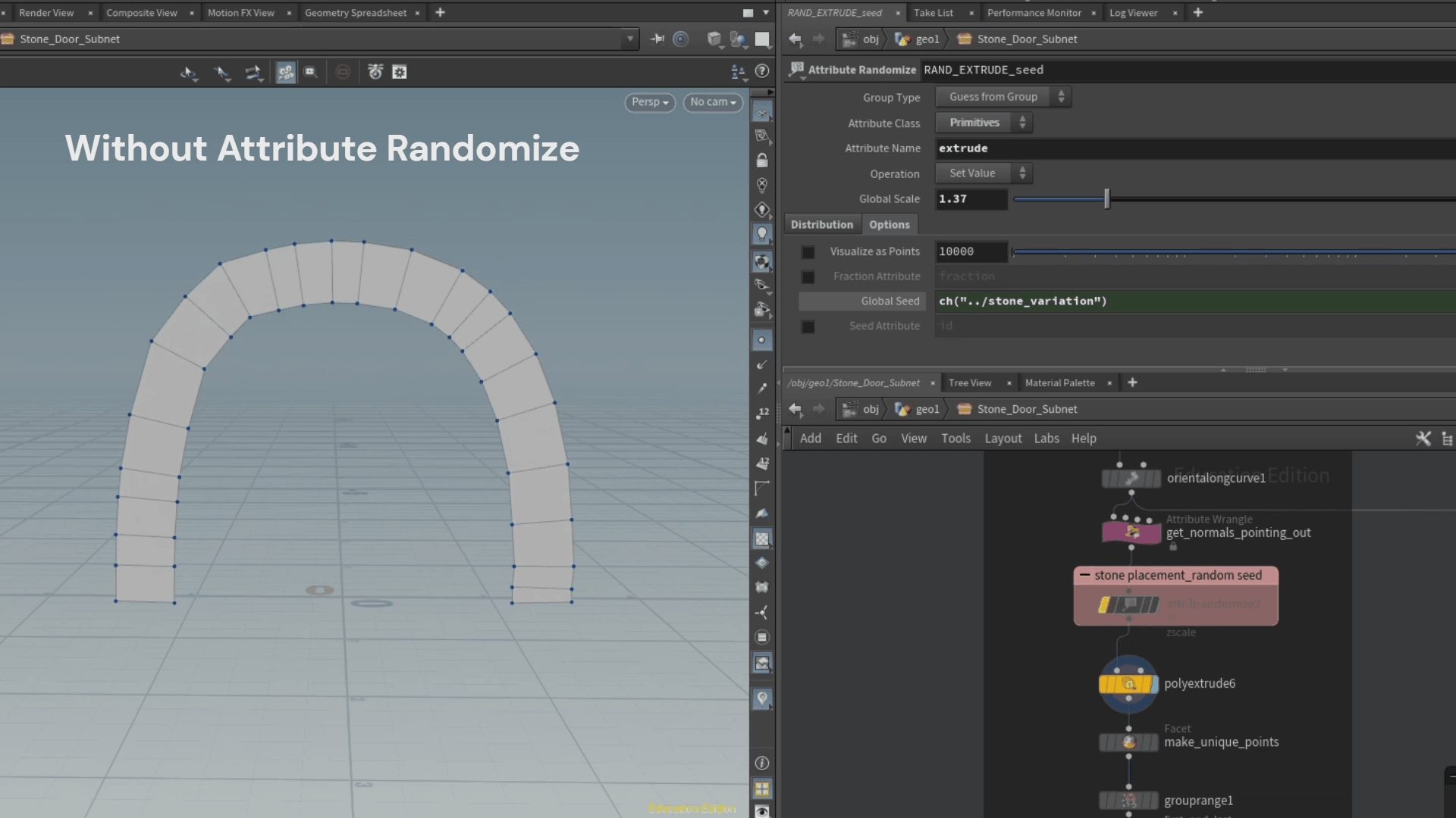 The arch is created by beveling the plane and extracting the primary edge. This edge is then resampled and modified using an Attribute VOP, which introduces randomization to the point positions using noise.