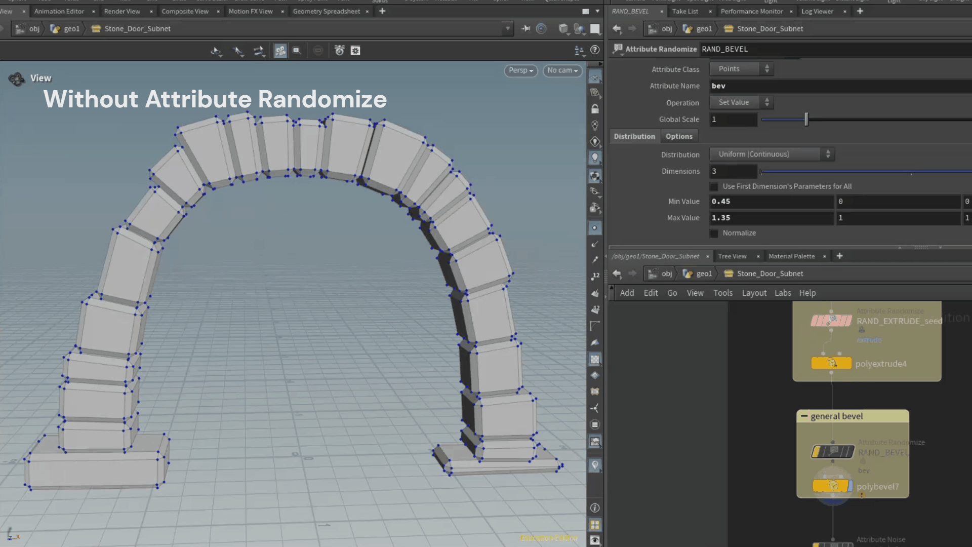 A similar Attribute Randomize technique was applied to generate a varied bevel range on each point, resulting in a more handcrafted appearance.