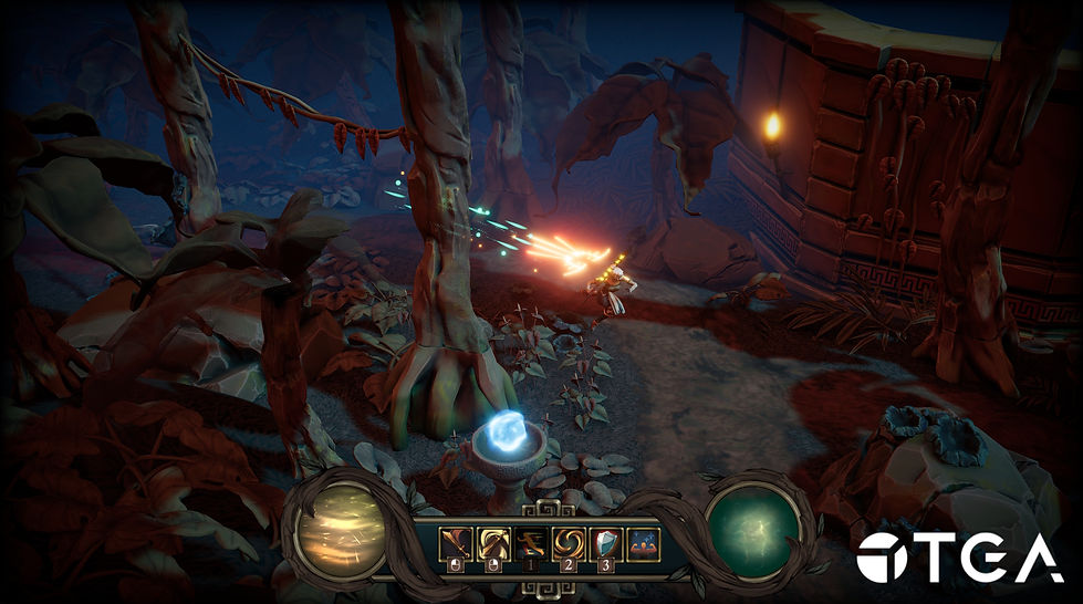 The health orb (left circle) is inspired by the main character's golden tattoos that shine on her arms. I wanted to represent that same golden look in her health. The energy orb (right circle) represents her connection to nature, which goes together with her abilities that are also green.
