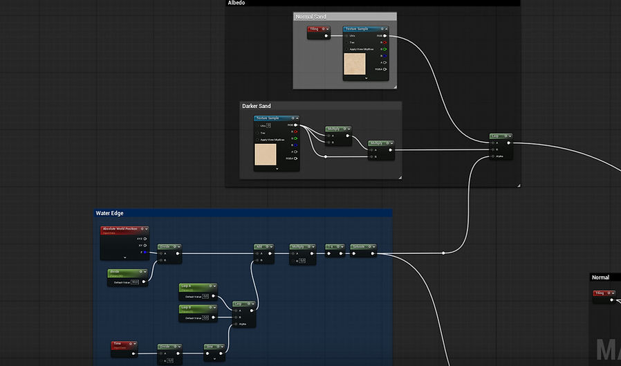 This mask is then used as the alpha input in a lerp node, blending between two sets of albedo, roughness, and normal map textures representing dry and wet sand. This creates the effect of the sand becoming darker, smoother, and more saturated where the water has passed.