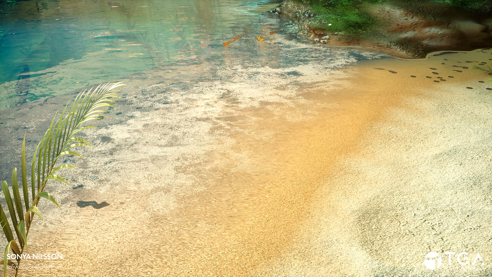 To finalize the water functionality, I implemented a shoreline effect to visualize where the water reaches the beach, causing the sand to appear darker and wet.
